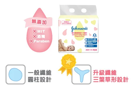 初生嬰兒身體發展尚未完備,便便次數一般較為頻密,相對應清潔的次數亦會較多。如選擇一些普通純水的濕紙巾,多次的摩擦難免為BB屁股肌膚造成負擔。強生嬰兒護膚柔濕巾採用三葉草形設計升級纖維,比起一般的圓柱設計纖維排列更緊密,令柔濕巾更堅韌、更柔軟、防滲漏,即使使用次數多,都不會傷害寶寶幼嫩肌膚。